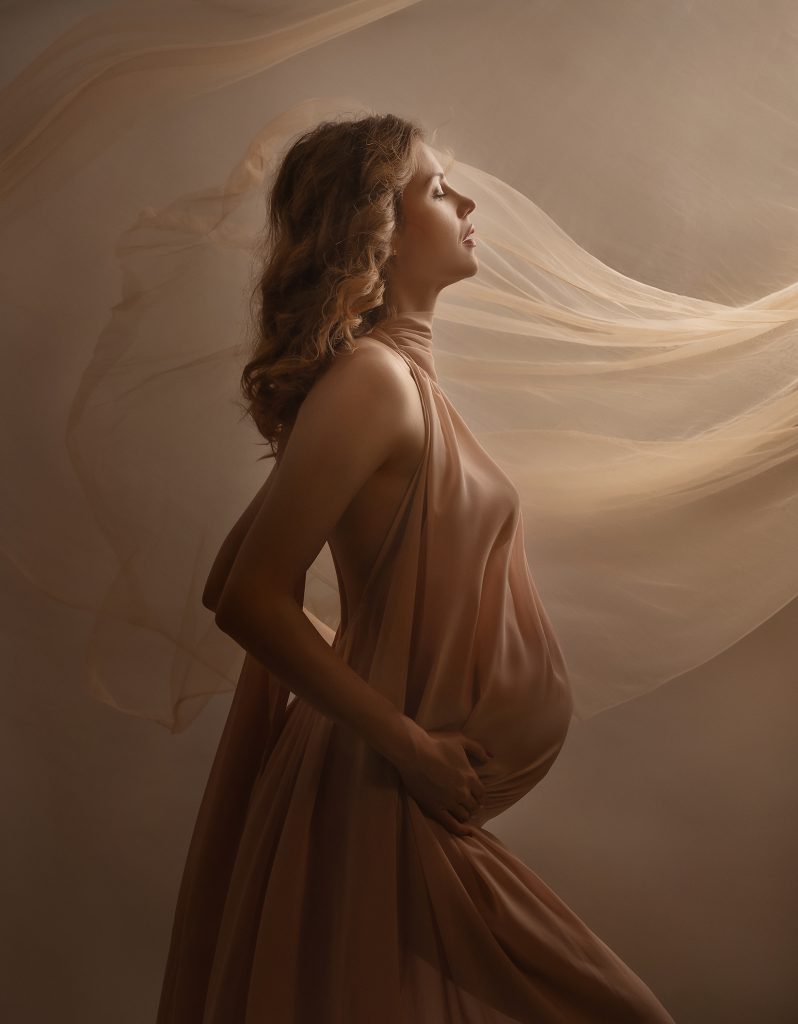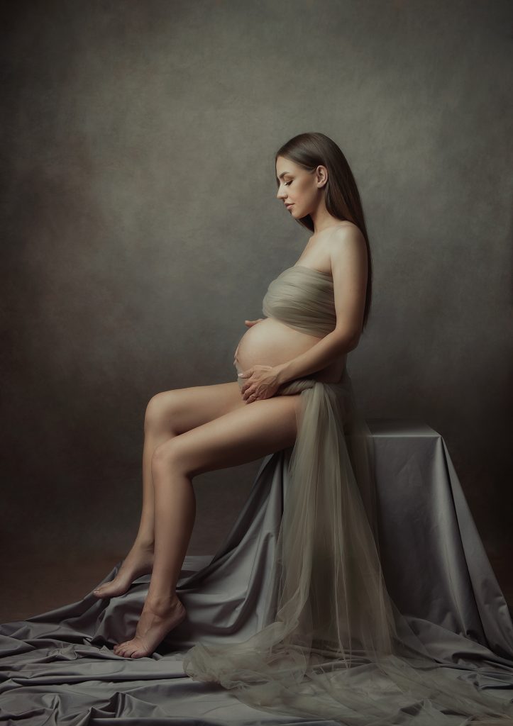 Fine art maternity sessions often incorporate carefully draped fabrics – silk, chiffon, tulle, or velvet arranged around the body to create sculptural, artistic effects. This technique references classical artistic traditions while adding movement, texture, and visual interest.